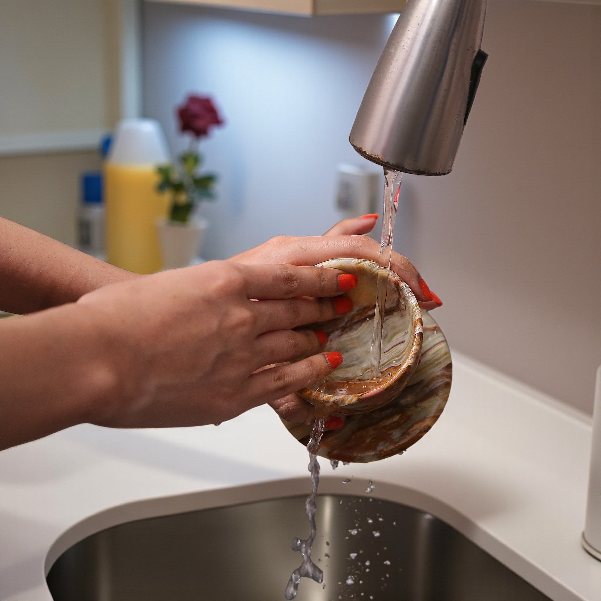 Miscellaneous: For optimal freshness, water should be replaced every 2-3 days. To care, gently hand wash the item with mild soap and water, avoid abrasive soap to keep the natural luster of the marble.