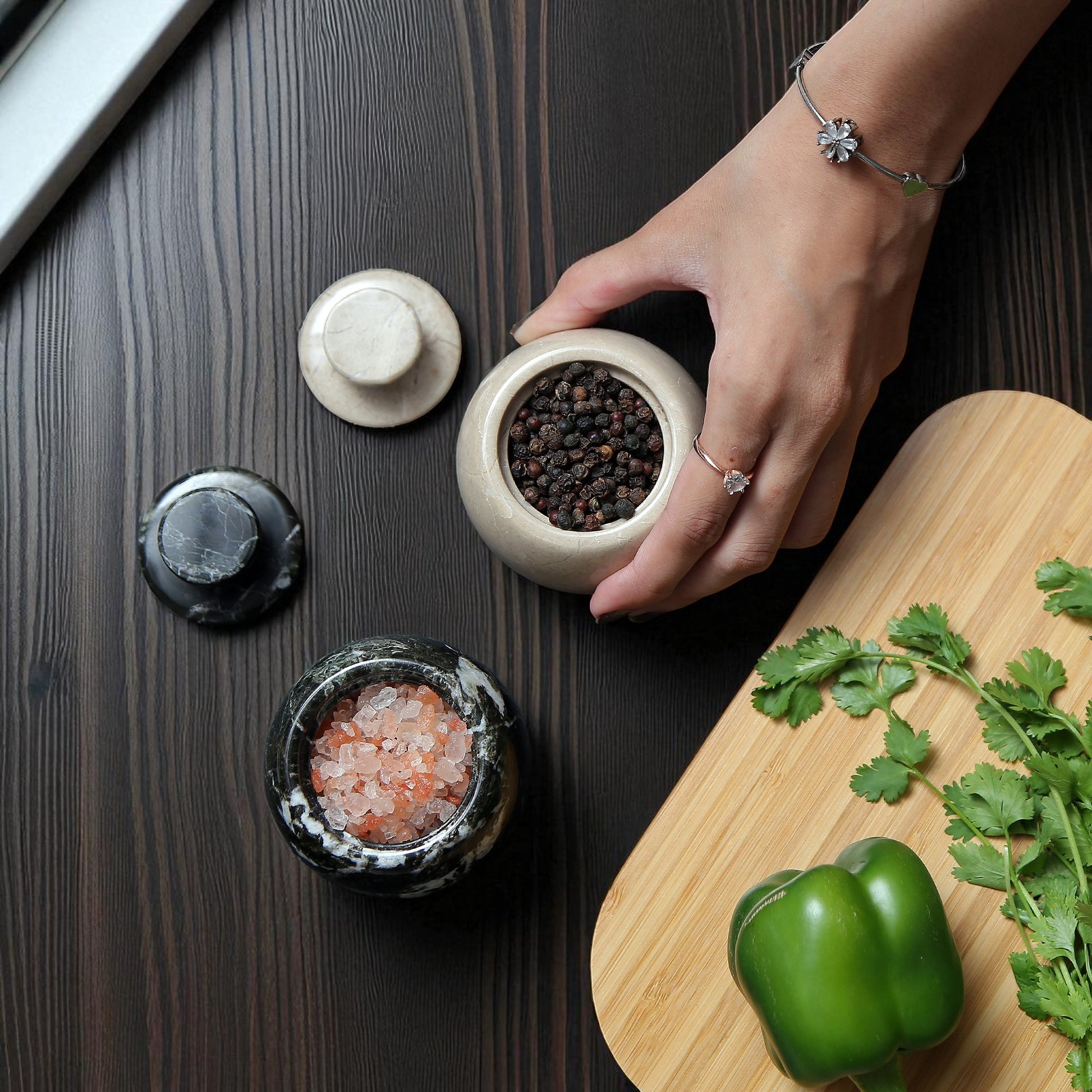 Perfect Size & Design: Measuring 3" x 2.5" and weighing 16.22 oz each, these elegant marble salt containers enhance your countertop while keeping salt, pepper, or spices fresh and within reach.