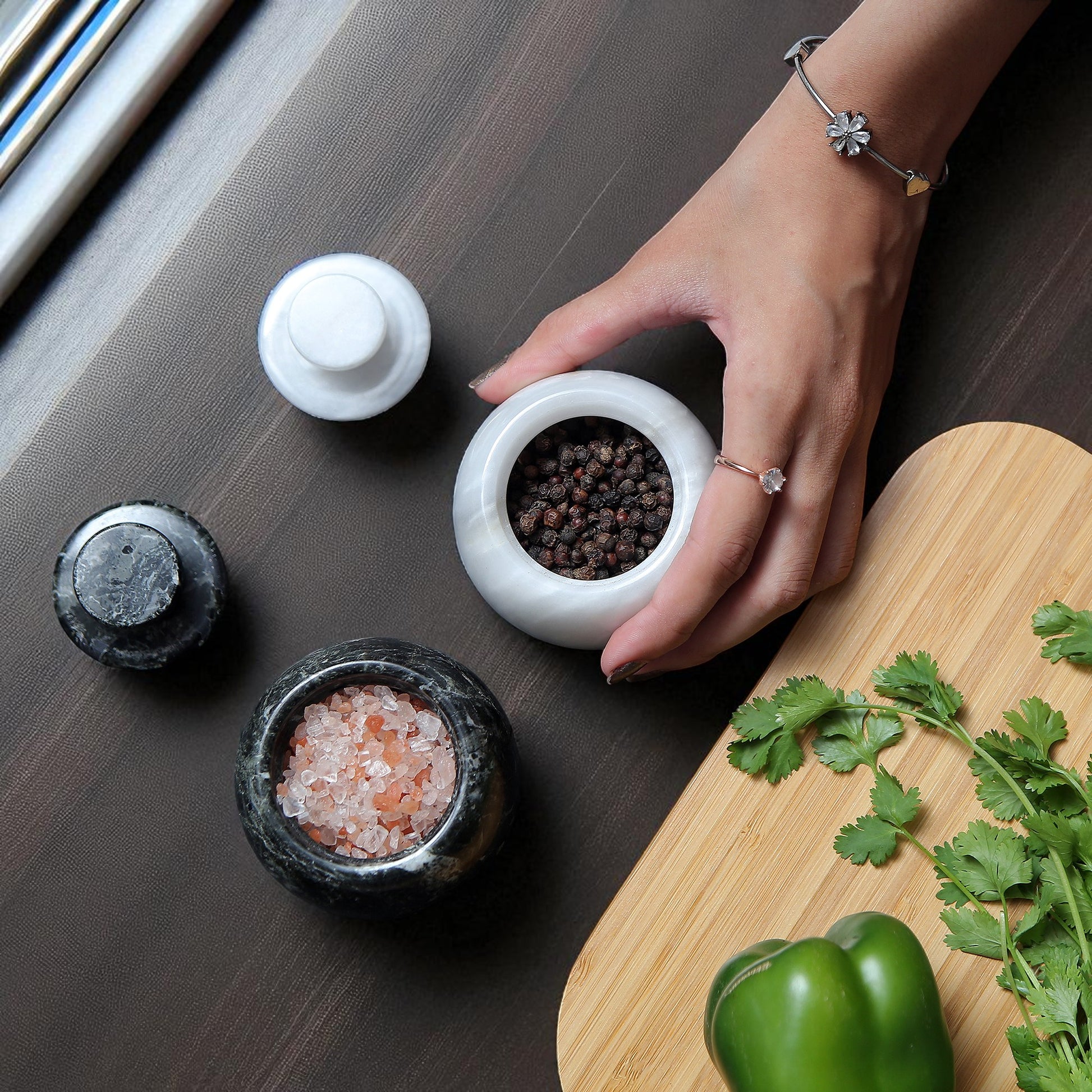 Perfect Size & Design: Measuring 3" x 2.5" and weighing 16.22 oz each, these elegant marble salt containers enhance your countertop while keeping salt, pepper, or spices fresh and within reach.